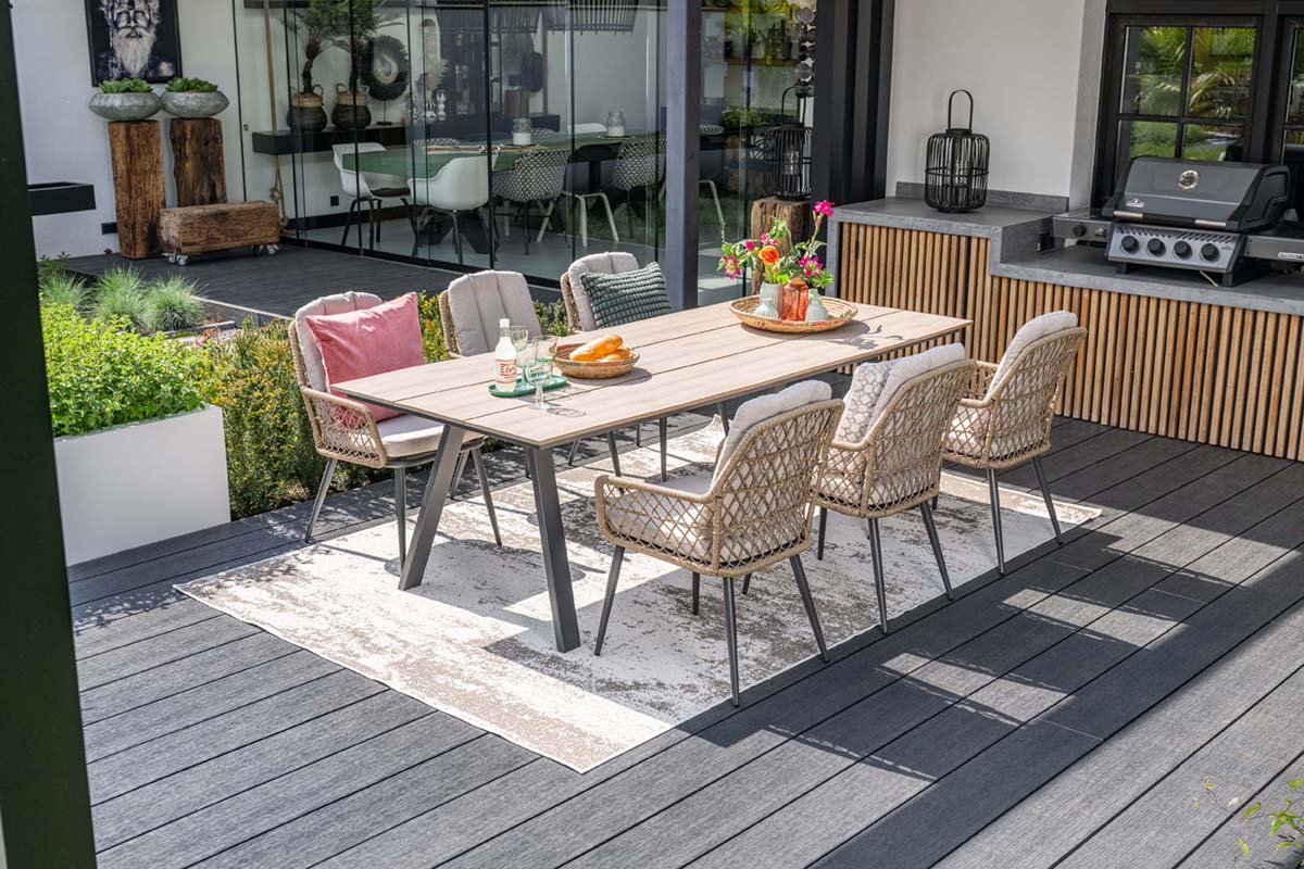 De stoelen zijn opgebouwd uit een lichtgewicht aluminium frame met poedercoating, wat zorgt voor een stevige en duurzame basis die geschikt is voor buitengebruik. De arm- en rugleuningen zijn afgewerkt met handgevlochten kunststof draad, dat de uitstraling heeft van echt wicker, maar weinig onderhoud nodig heeft.