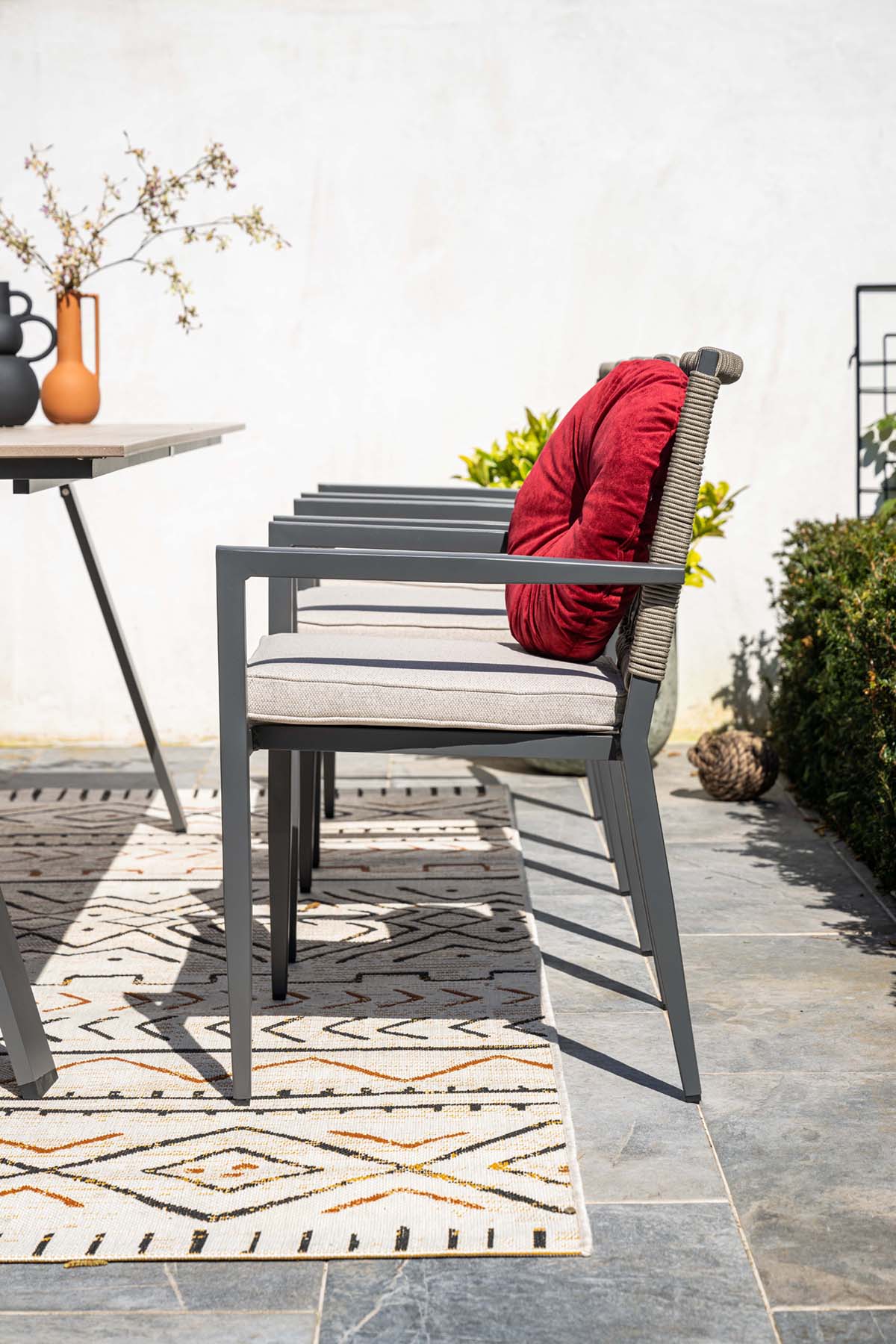 Elke stoel wordt geleverd met een comfortabel zitkussen van waterafstotend polyester. Lichte regen kan eenvoudig worden afgeklopt. Voor langdurig behoud wordt geadviseerd de kussens bij slecht weer droog op te bergen.
