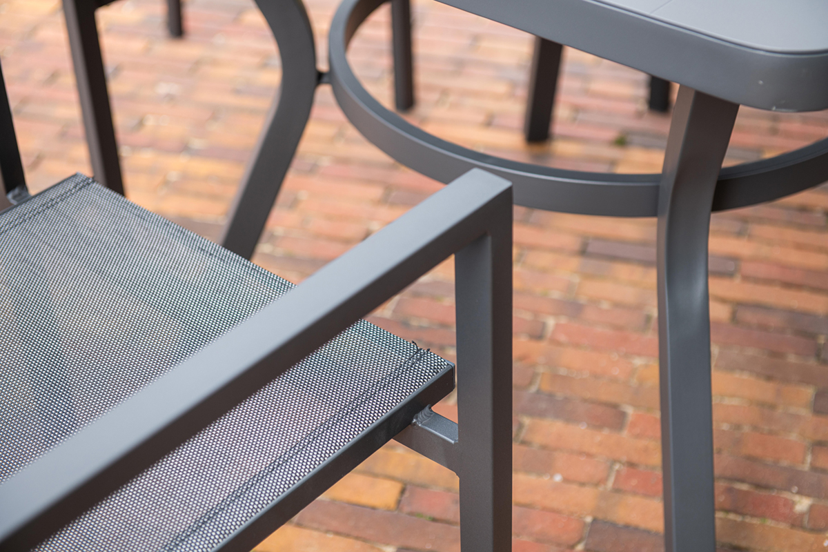 De zitting en rugleuning zijn uitgevoerd in textileen all-weather doek. Dit materiaal is ademend, comfortabel en sneldrogend, waardoor de stoel na een regenbui snel weer prettig zit.