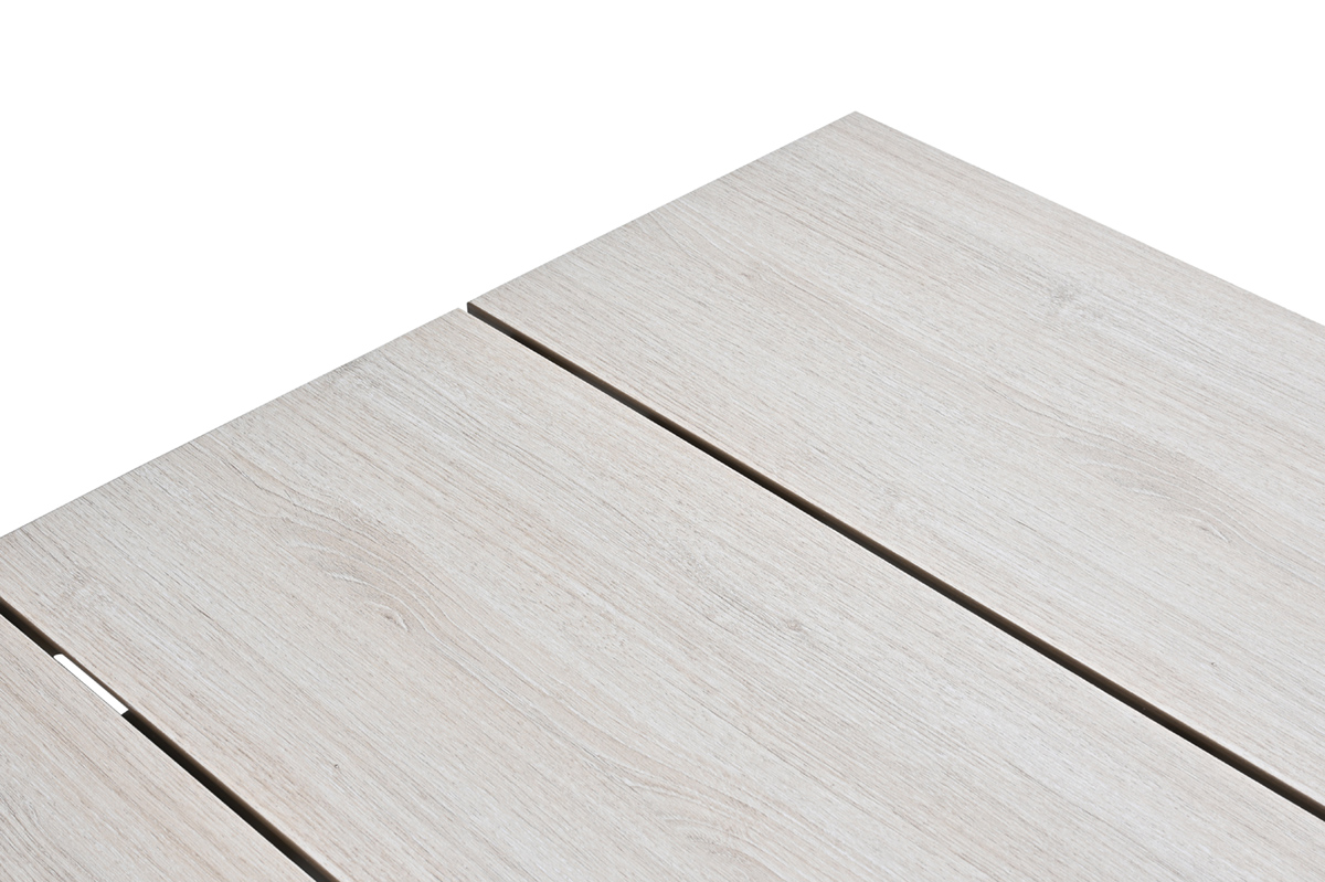 Het frame van de Nevada dining tafel is vervaardigd uit aluminium en afgewerkt met een beschermende poedercoating. Dit zorgt voor een stevige constructie en maakt de tafel geschikt voor langdurig buitengebruik. Het tafelblad is uitgevoerd in Vironwood in de kleur light teak. Deze duurzame kunststof houtimitatie heeft een realistische, voelbare houtnerf en combineert de uitstraling van hout met het gemak van eenvoudig onderhoud.