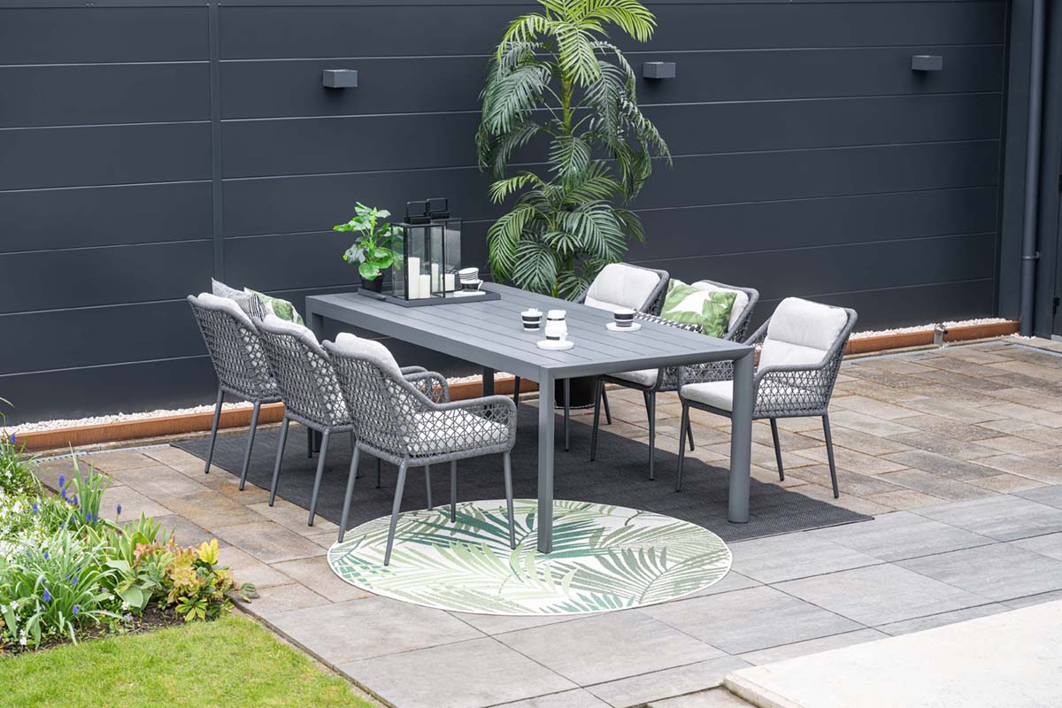 De stoelen zijn voorzien van een lichtgewicht aluminium frame met poedercoating, wat zorgt voor een stevige, duurzame en onderhoudsvriendelijke basis. De rug- en armleuningen zijn afgewerkt met handgevlochten kunststof koord, dat een zachte uitstraling heeft en prettig zitcomfort biedt. Het materiaal is sterk, kleurvast en geschikt voor buitengebruik.